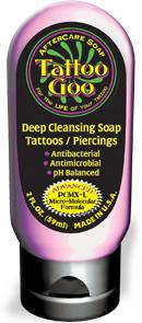 Tattoo Goo Deep Cleansing Soap is for the air in cleaning tattoos as well as piercings. It is a similar product to Satin and Provon. It contains PCMX (03%) 0.3% Chloroxylenol. It is sold in a 2FL.)Z (59ml) bottle