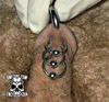 Variations on the frenum include the frenum ladder (third picture, first row), a series of piercings, often along the dorsal mid-line or raphé (the mid-line on the underside of the penis), or the frenum loop (first picture, second row), where a single ring is attached by a frenum piercing and encircles the shaft.