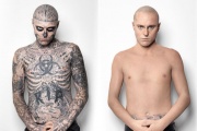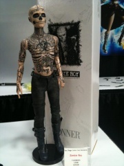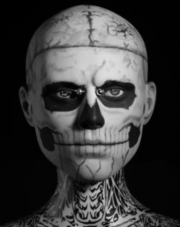 Rick Genest (born August 7, 1985), also known as Zombie Boy, is a performer who is well known for his skeletal tattoos which cover 80% of his body. He is from Montreal, Quebec. He has appeared in a music video with Lady Gaga for her song "Born this Way" and has also been a runway model for Thierry Mugler. He has appeared in Bizarre Magazine. He has a carnival project called Lucifer’s Blasphemous Mad Macabre Torture Carnival. In 2011, he became the first male model for Dermablend makeup.