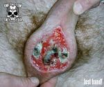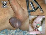 Those who have successfully utilized this method report that the pain is agonizing for the first twelve hours, but after that, the feeling dulls until the testicles are entirely dead. At this point, the entire scrotum and testes can be cut off below the band without any pain or bleeding. The band is left on until the area is healed enough to hold together on its own. This method of castration is commonly done on farms and is also the method favored by home (DIY) and BDSM practitioners, due to its relative simplicity and safety. An added benefit to this method is that it also removes the scrotum during the process of destroying the testicles. If the scrotum is left on, sepsis (blood poisoning) and infection are very real risks if dry gangrene doesn't set in like it should. On the other hand, if the band is removed too soon after removing the scrotum, major and uncontrollable bleeding is risked.