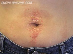 Impetigo is a common and very contagious form of infection caused by staphylococcus bacteria (and sometimes streptococcus bacteria). Impetigo can break out on otherwise undamaged skin, and can cluster or start around a fresh or irritated piercing or tattoo. Assuming the mod is still healing, it can damage the healing and cause a secondary infection in the mod itself. It is also possible for an infection to be the cause of the impetigo or how it was introduced if you were at a studio with poor contamination control procedures. Impetigo may also leave (usually minor) permanent scarring. The best way to avoid impetigo is good hygiene, but it is certainly possible to get it even with strict maintenance.