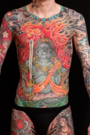 A popular tattoo design, Fudomyo-O is usually pictured with a lasso in one hand to bind the faithful and a sword in the other to cut through ignorance, on a backdrop of fire which purges all wickedness. A tattoo of Fudo Myo-O protects its wearer from evil and natural disasters (like fires).