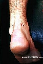 Widely regarded as a myth, the achilles piercing is a piercing which passes between the achilles tendon and the ankle. Although extremely rare, it is real, and healed examples do exist. PFIQ once even documented a man with a large stretched achilles piercing that he was able to suspend from (see also foot crucifixion suspension).