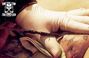 Steel needles, usually of greater diameter and steeper shoulder than those used in the West, are arranged in rows, singly or stacked, and are tied to a long handle of bamboo. This tool is held in the right hand, with the fingers of the left used to spread the skin to be tattooed. The shaft of the tebori tool rests on the thumb of the left hand and the needles inserted by the force of forward movement of the right arm of the tattoo artist. Unlike many other forms of hand-tattooing in Asia such as tatau or moko, no assistants are required for tebori.