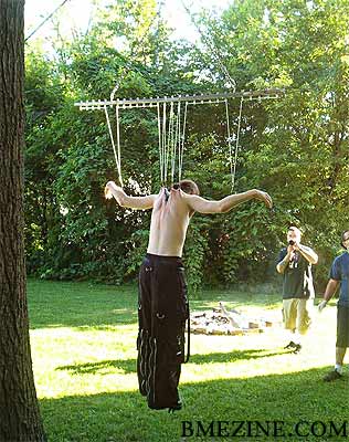 A crucifix suspension is a form of vertical suspension in which two or more flesh hooks also support the arms, thus positioning the body in a "crucifixion" pose. Usually this suspension is done from the back (like a suicide suspension) but it can be done from the chest as well.