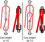 To simplify, in a 1:1 pulley system, to lift a 100 pound weight one foot, you will need to apply 100 pounds of force on the end of the rope for a distance of one foot. However, when using a 2:1 pulley system, to lift a 100 pound weight one foot, you will need to apply only 50 pounds of weight, but over a distance of two feet (that is, twice the distance, but half the weight) — basically it's the same as using a lever to lift something. The ratio used above to describe the amount of weight being lifted versus the weight applied is often refered to as the "mechanical advantage" (MA) of the system.