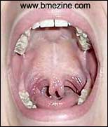 The uvula splitting is an uncommon modification. It sometimes occurs unintended when the body rejects an uvula piercing. It is also a modification people voluntarily get. Jon Cobb describes his motivation in piercing his uvula as being related to conceptually piercing something deep inside his head. Splitting could also have symbology to those who get it.