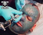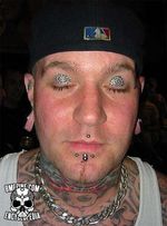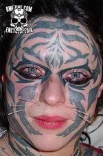 The most common examples of this type of tattooing is 'permanent makeup' tattoos, mimicking eye shadow and/or eyeliner. Designs have been done in the past (i.e. open pupils), but the tendency for the eyelid to be somewhat wrinkled even when closed often obscures such designs and prevents the desired effect.