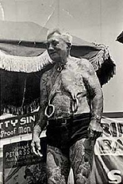 Rasmus Nielson (born in Denmark in the 1870s), the Scandinavian Strong Man, was a tattooed performer in the 1930's. In addition to his bodysuit of tattoos, Rasmus had a number of large piercings which he used for lifting objects (such as an anvil from his chest). Rasmus told a fictitious story of abduction and forcible tattooing like many others and explained his piercings as the result of a torturous suspension at the hands of the South Seas Islanders who had allegedly captured him.