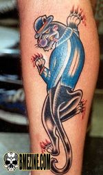 Its popularity waned over the years, thanks in part to Shotsie Gorman's NO BLACK PANTHERS stickers, as well as a general move away from traditional American tattooing. The panther is regaining popularity, riding the wave of the new "old school/new school" throwbacks. It is not uncommon to see the panther reinterpreted to suit the times.