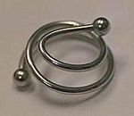 A nipple coil is a spiraling piece of nipple jewelry designed to both lift and extend the nipple (usually for the purpose of nipple stretching) and to be decorative as well. Some nipple coils have a distinct place for the nipple to rest (like the crossbar in the pictured example), and others allow the jewelry to be rotated through the piercing so any desired amount of lift can be achieved.