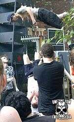 A Tandem Suspension is a suspension in which one person is suspended by hooks from another person. This suspension was originally named by (and first done in the West by) Allen Falkner, who first did it with Oliver from TSD. That is, one person is suspended normally, and then a second set of hooks is attached below them. The ropes from these hooks then suspend the second person (ie. it's not two people suspending side-by-side).